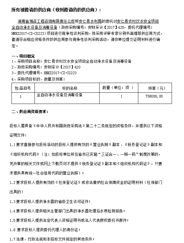 安仁縣農(nóng)村飲水安全項目全自動凈水設(shè)備及消毒設(shè)備談判公告