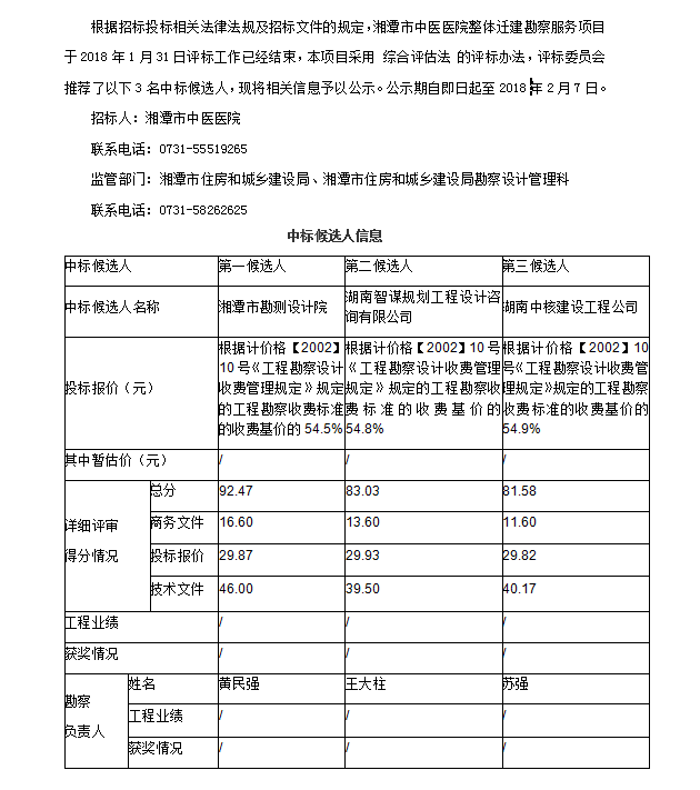 湘潭市中醫(yī)醫(yī)院整體遷建勘察服務(wù)項目中標(biāo)候選人公示