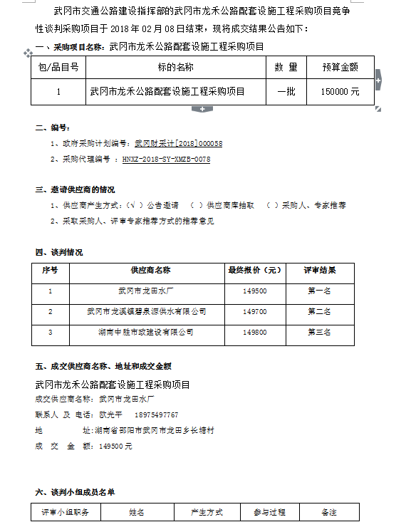 武岡市龍禾公路配套設(shè)施工程采購項(xiàng)目 競(jìng)爭(zhēng)性談判成交結(jié)果公告