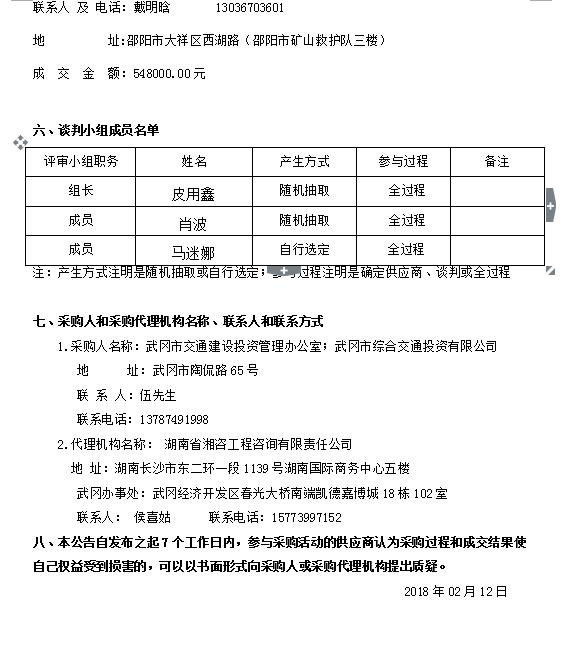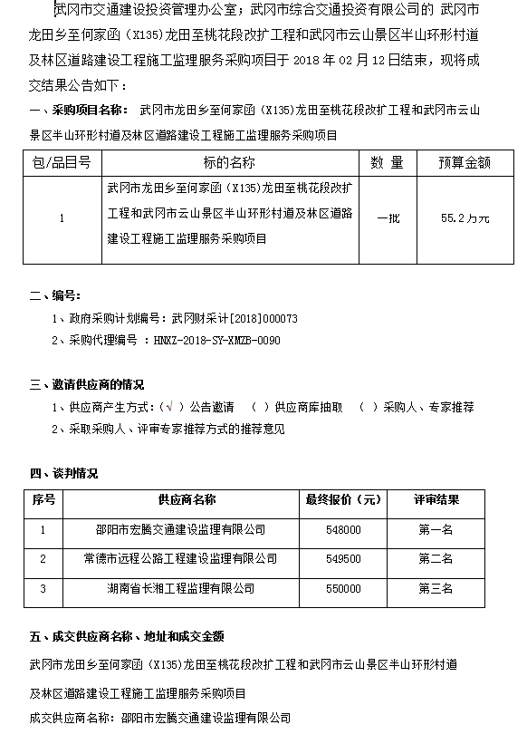 武岡市龍?zhí)镟l(xiāng)至何家函(X135)龍?zhí)镏撂一ǘ胃臄U工程和武岡市云山景區(qū)半山環(huán)形村道及林區(qū)道路建設工程施工監(jiān)理服務采購項目 競爭性談判成交結(jié)果公告