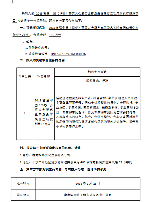 2018首屆中國(guó)(華容)芥菜大會(huì)廚藝比賽及品鑒晚宴活動(dòng)策劃執(zhí)行服務(wù)項(xiàng)目單一來源公告