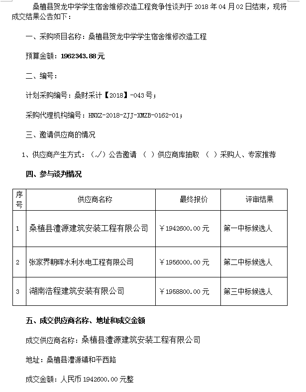 桑植縣賀龍中學(xué)學(xué)生宿舍維修改造工程競爭性談判 成交結(jié)果公告