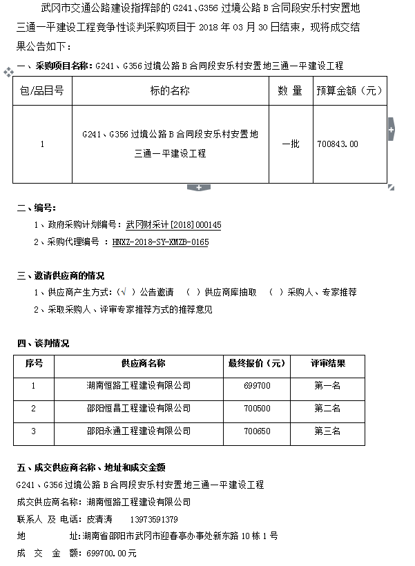 G241、G356過境公路B合同段安樂村安置地三通一平建設(shè)工程  競爭性談判成交結(jié)果公告