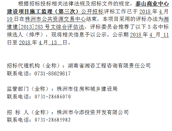 泰山商業(yè)中心建設(shè)項(xiàng)目施工監(jiān)理(第三次)招標(biāo)投標(biāo)信息公示表