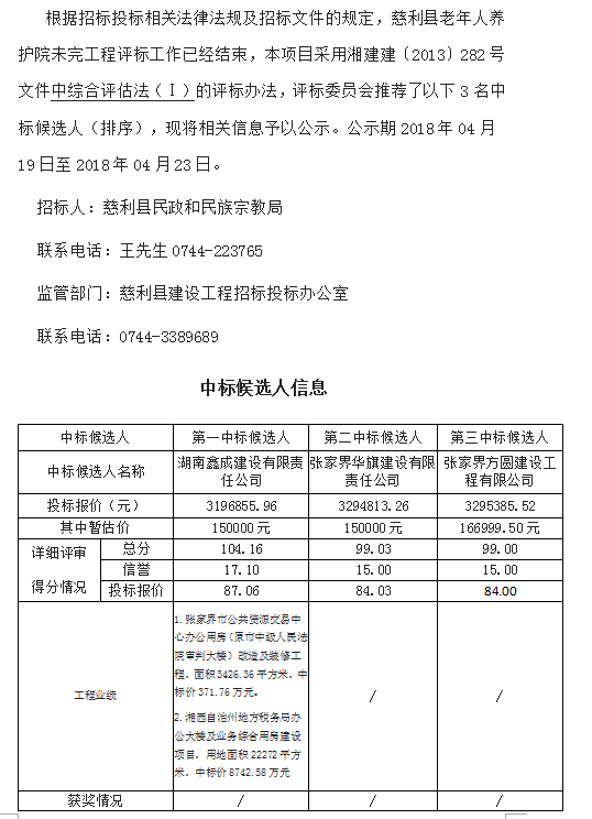 慈利縣老年人養(yǎng)護(hù)院未完工程施工招標(biāo) 中標(biāo)候選人公示